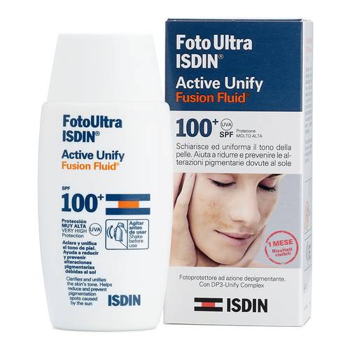 Foto Ultra Active Unify Fusion Fluid SPF 100+ Schiarisce ed uniforma l'incarnato. Aiuta a ridurre e prevenire le alterazioni pigmentarie causate dal sole. Aiuta a normalizzare la produzione di melanina grazie al DP3-Unify Complex, che agisce sulle fasi principali della melanogenesi. Modalità d'uso Applicare la mattina e a mezzogiorno. Riapplicare ogni 2 ore e tanto frequentemente quanto necessario. Per un risultato ottimale, applicarlo per 3 mesi. Componenti Aqua (Water), Dibutyl Adipate, Cyclopentasiloxane, Octocrylene, Niacinamide, Alcohol Denat., Titanium Dioxide (Nano), Butyl Methoxydibenzoylmethane, Cyclohexasiloxane, ...