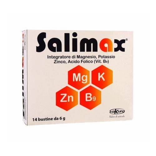 Salimax È un integratore alimentare a base di sali minerali (magnesio, potassio e zinco) e acido folico utile in tutti i casi di ridotto apporto con la dieta o di aumentato fabbisogno di tali nutrienti, come la gravidanza. Salimax aiuta a contrastare situazioni di stanchezza, affaticamento e al mantenimento di normali funzioni psicofisiche grazie alla presenza di magnesio e acido folico. Il magnesio contribuisce alla normale funzione muscolare, alla riduzione della stanchezza e dell'affaticamento e all'equilibrio elettrolitico. Il potassio contribuisce al mantenimento di una normale pressione sanguigna e al normale funzionamento ...